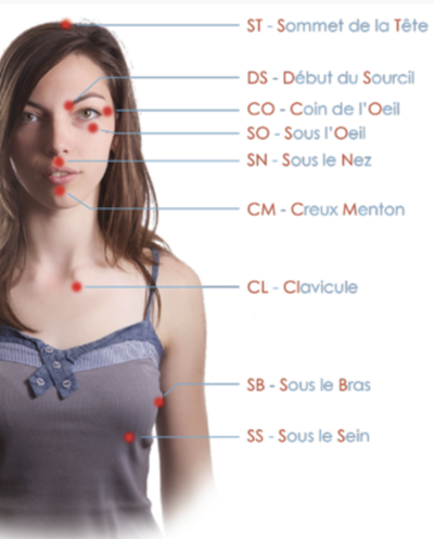 3) La ronde du tapping peut alors commencer : elle part du sommet de la tête, pour suivre un circuit passant par différents points sur le visage et le haut du buste.